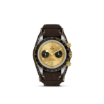 Corona di carica a vite con la rosa TUDOR in rilievo. Pulsanti a vite in oro giallo massiccio a ore 2 e 4. Acciaio rivestito da uno strato di oro giallo di 0,3 mm