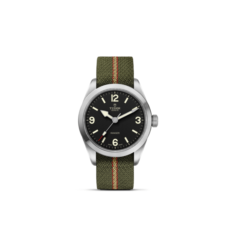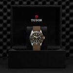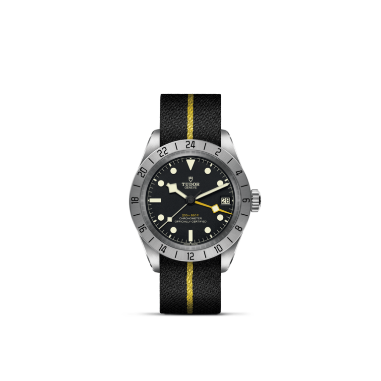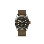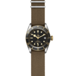 Corona di carica a vite con incisa la rosa TUDOR laccata nera e con tubo della corona in alluminio anodizzato nero. Acciaio rivestito da uno strato di oro giallo di 0,3 mm