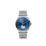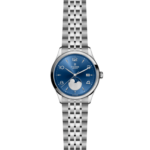 Quadrante blu, finitura satinata <i>soleil</i>, con numeri applicati e indicatore delle fasi lunari