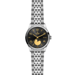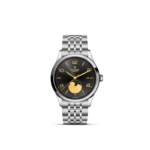 Quadrante nero, finitura satinata <i>soleil</i>, con numeri applicati e indicatore delle fasi lunari